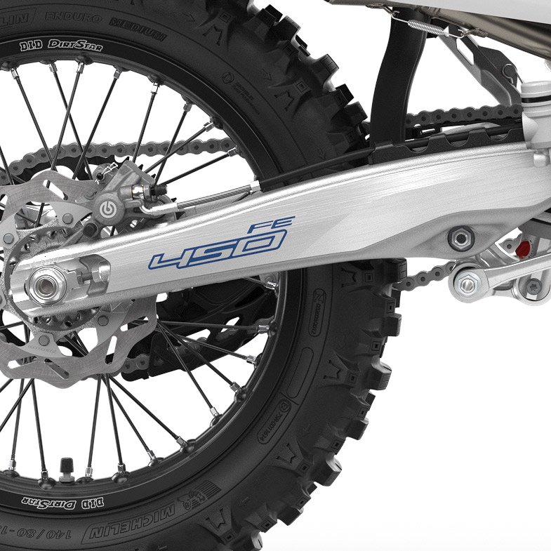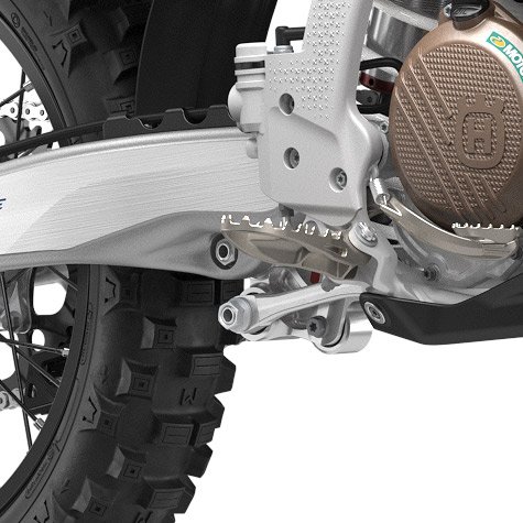 The new hollow die-cast aluminium swingarm is manufactured from a single piece of aluminium using an improved casting process for optimal stiffness and a 190 g weight reduction. In order to optimise and match the flex characteristics of the new frame, a new 22 mm rear axle is fitted. Additionally, the chain guard and chain slider have been completely redesigned for improved durability with the chain guard made with a rounder profile to prevent catching on external objects.